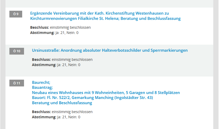 Dann finden Sie hier auch das Beschluss- bzw. Abstimmungsergebnis und eine Zusammenfassung des Sachvortrages bzw. des Beschlusses.